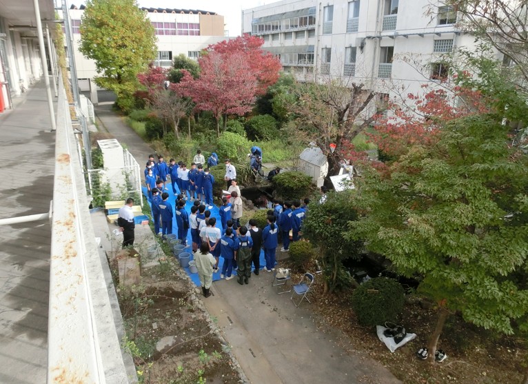ボランティアで集まった生徒、ムサシトミヨを守る会のスタッフ、熊谷市の環境政策課、本校の職員で協力して行いました。