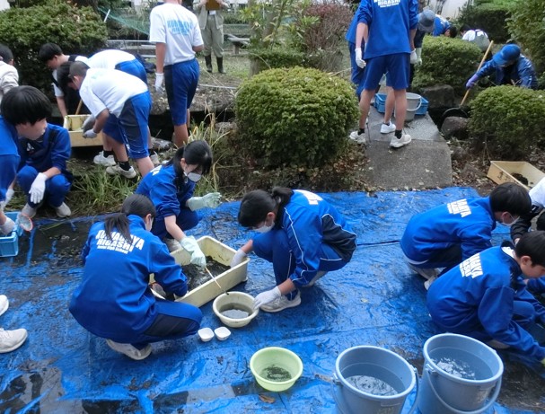 今日は、13:55から本校中庭のトミヨ池で「ムサシトミヨ繁殖調査」を実施しました。