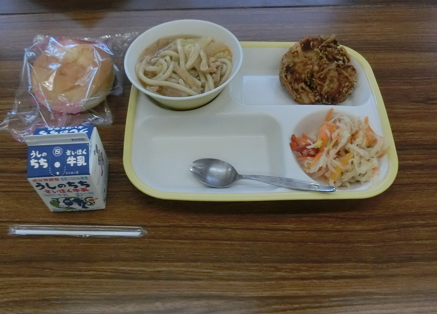 今日は、「ライスボールパン、牛乳、熊谷うどん、冬野菜のかき揚げ、切り干し大根のサラダ(バンバンジードレッシング)」でした。
