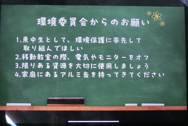 生徒朝会(環境委員会) 2025年11月26日 最終更新日時 : 2025年11月26日 kumagaya_edit 今朝は、環境委員会による「生徒朝会」がオンラインで行われました。ムサシトミヨについてのクイズや繁殖活動の紹介、また、環境に関するお願いなど充実した内容でした。タブレットを使用した朝会への挑戦は、成功となりました!