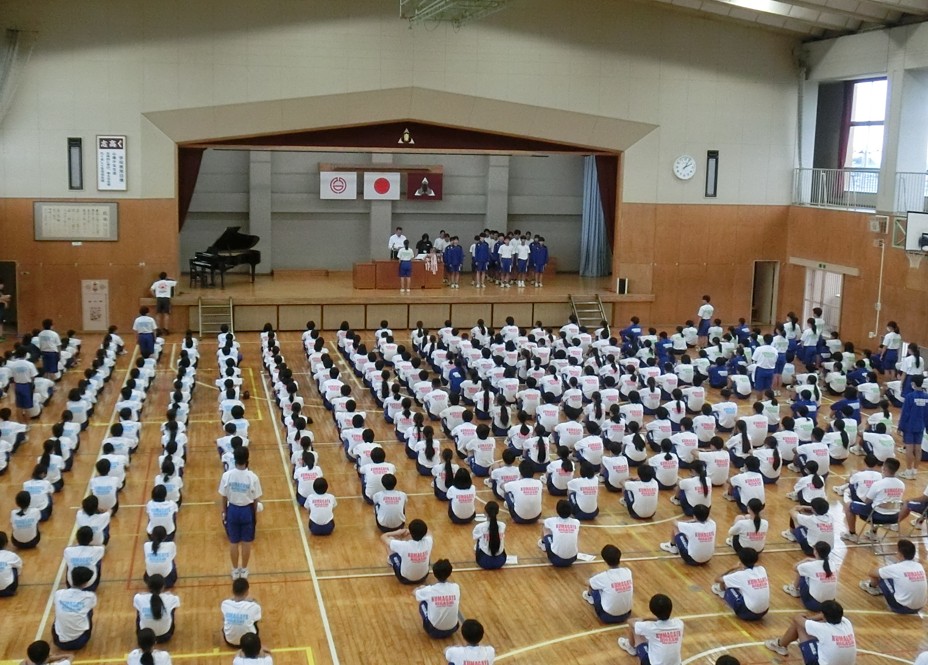 県大会で頑張ってきてほしいという願いを込めて、全校でエールを送りました。頑張れ、熊谷東中!