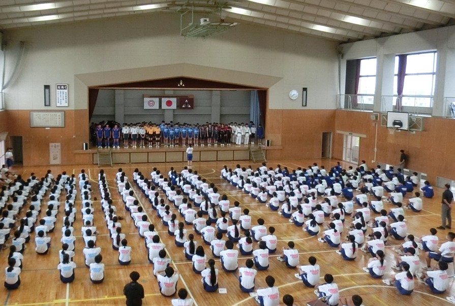 県大会壮行会では、延べ10の種目で県大会に出場します。色とりどりのユニフォームで登場した生徒たちは、とてもかっこよく見えました。
