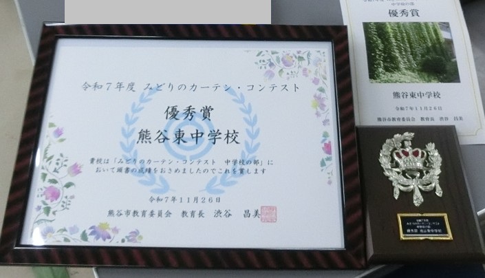今年度の、「みどりのカーテン・コンテスト 中学校の部」で、熊谷東中学校は「優秀賞」を受賞しました。